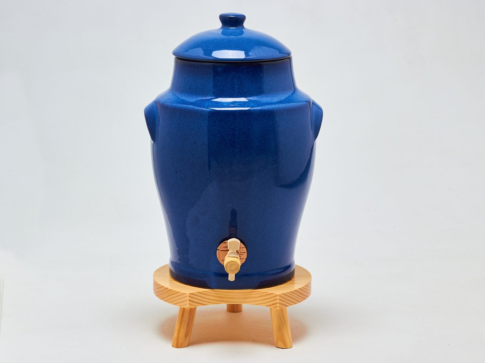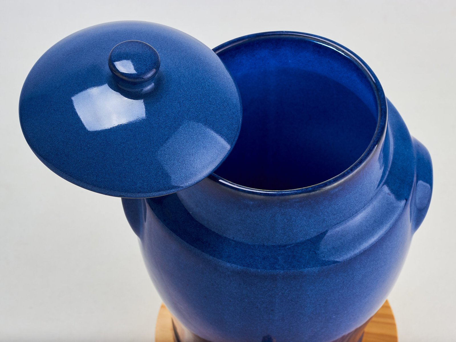 Vinaigrier en Grès Bleu 4L Poterie Artisanale Support en Bois pour la Macération à la Maison