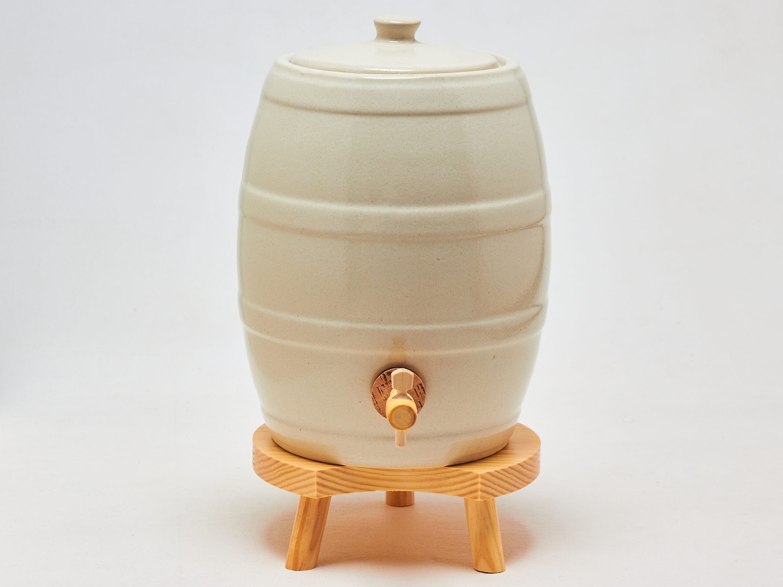 Vinaigrier en grès émaillé 5 L – Modèle tonneau avec robinet en bois et support en pin